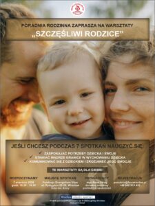 Zapraszamy na kolejne warsztaty pt.: „Szczęśliwi Rodzice” od 07.09.2026 r., które odbędą się w godz. 16.30 – 18.30.