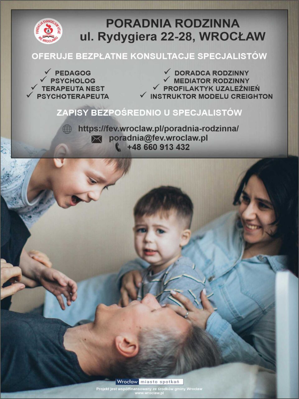 Z radością informujemy, iż od 12 stycznia 2026 wznawia działalność Poradnia Rodzinna przy FEV. Dzięki życzliwej współpracy z Wydziałem Zdrowia i Spraw Społecznych Urzędu Miasta Wrocławia możemy kolejny rok służyć Państwu bezpłatną pomocą.